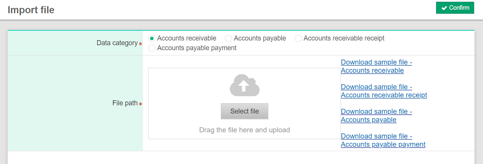 Yes, the system allows Excel file import of accounts receivable/payable, accounts receivable receipt, and accounts payable payment. Go to [Daily work] > [Import file] to import. You can download the sample file and fill out the information before importing, or drag existing Excel file directly to import.