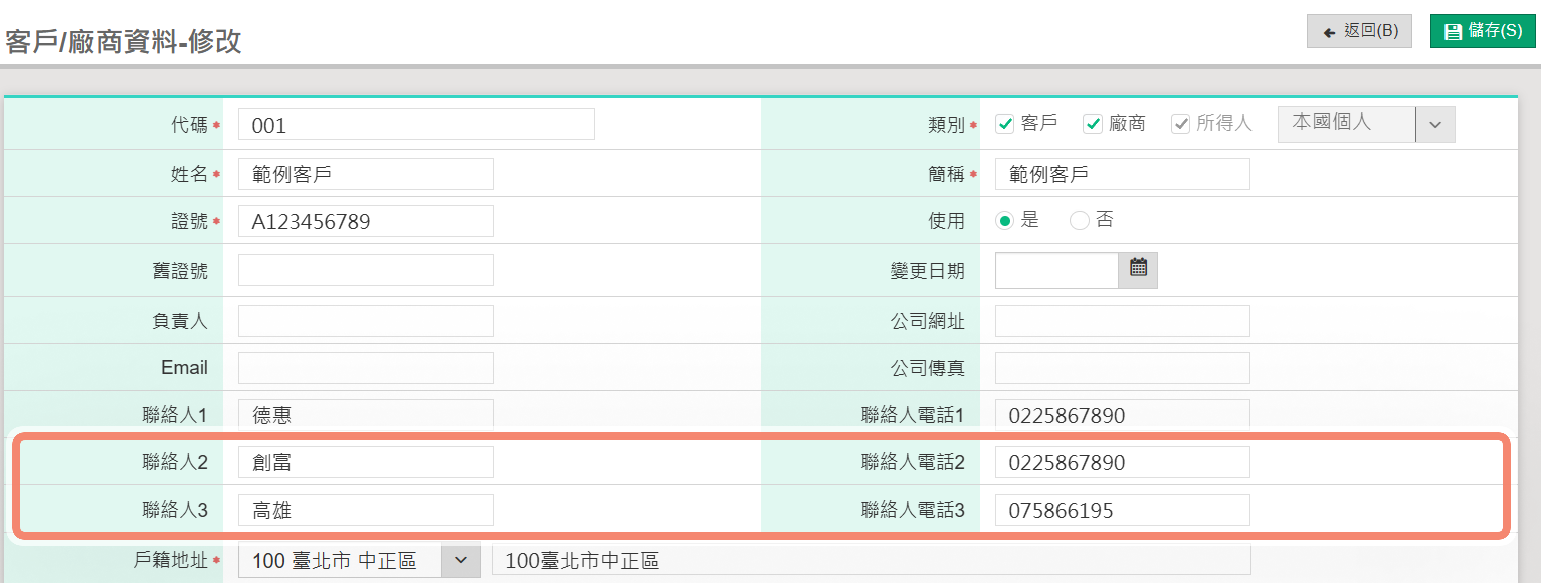進入畫面後即可開始登打客戶/廠商的資料,包含銀行資訊,也可以輸入第2~3位聯絡人資料,輸入完成後點擊右上角「儲存」即可。