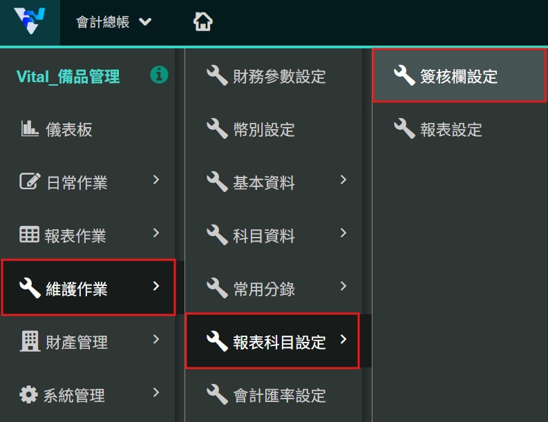1. 請至【維護作業】>【報表科目設定】>【簽核欄設定】。