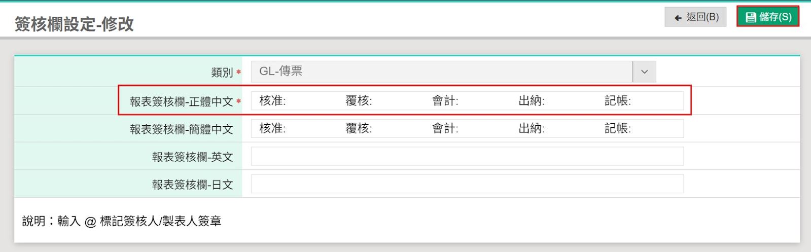4. 修改報表簽核欄內容後,點選右上角【儲存】即完成。