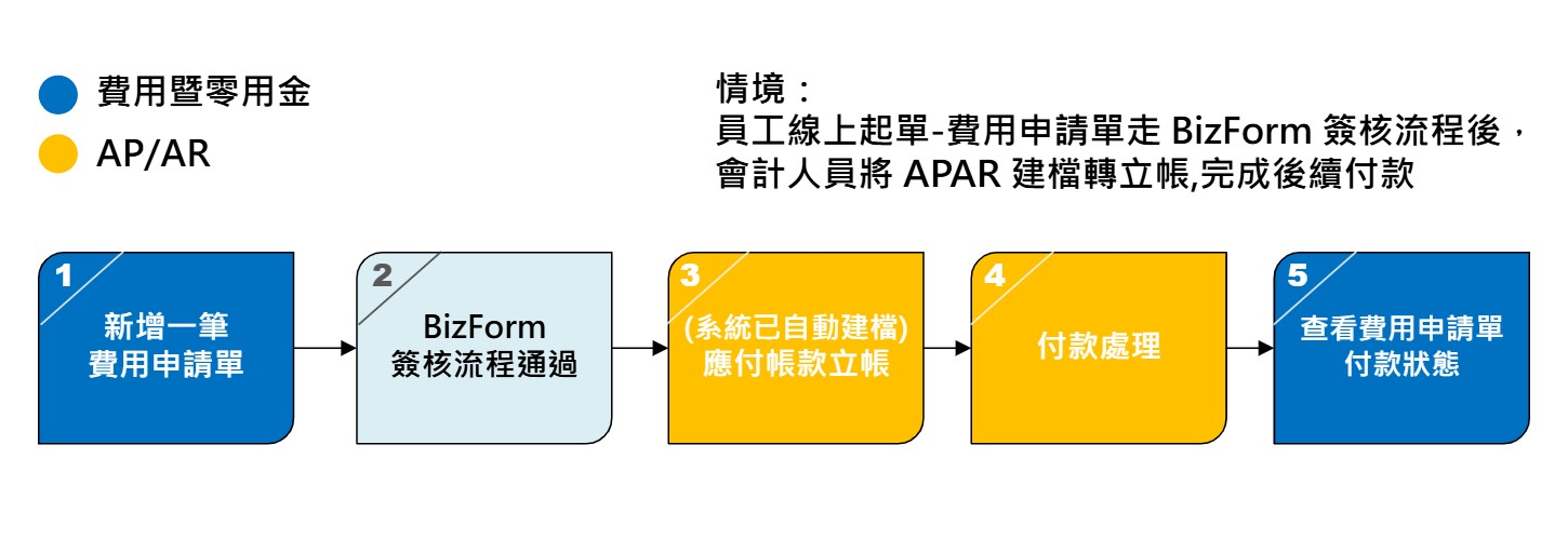 適用於員工須自行申請費用(走BizForm線上簽核),再由會計人員完成後續付款的情境,請依序觀看操作說明:
