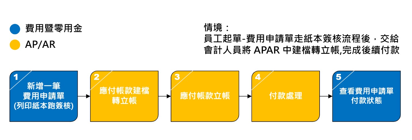 適用於員工須自行申請費用(走紙本簽核),再由會計人員完成後續付款的情境,請依序觀看操作說明: