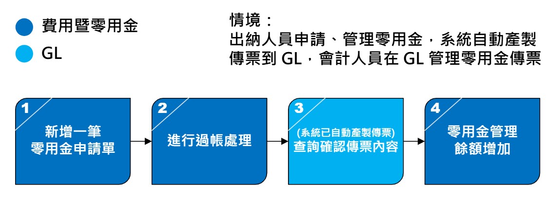 適用於出納人員管理零用金,會計人員管理傳票的情境,請依序觀看操作說明: