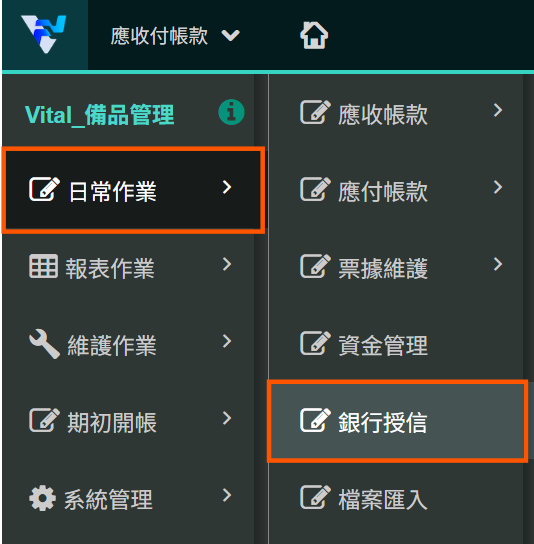 作業位置:日常作業 / 銀行授信。 提供輸入與維護各家銀行提供的短期、長期授信資訊。