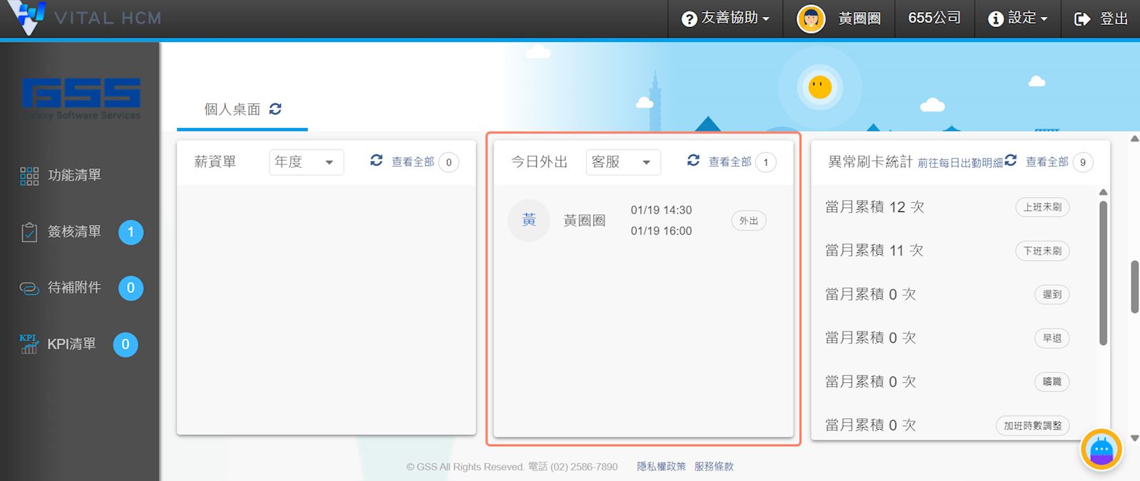 今日外出欄位會顯示請假(包含休假)與外出資料。