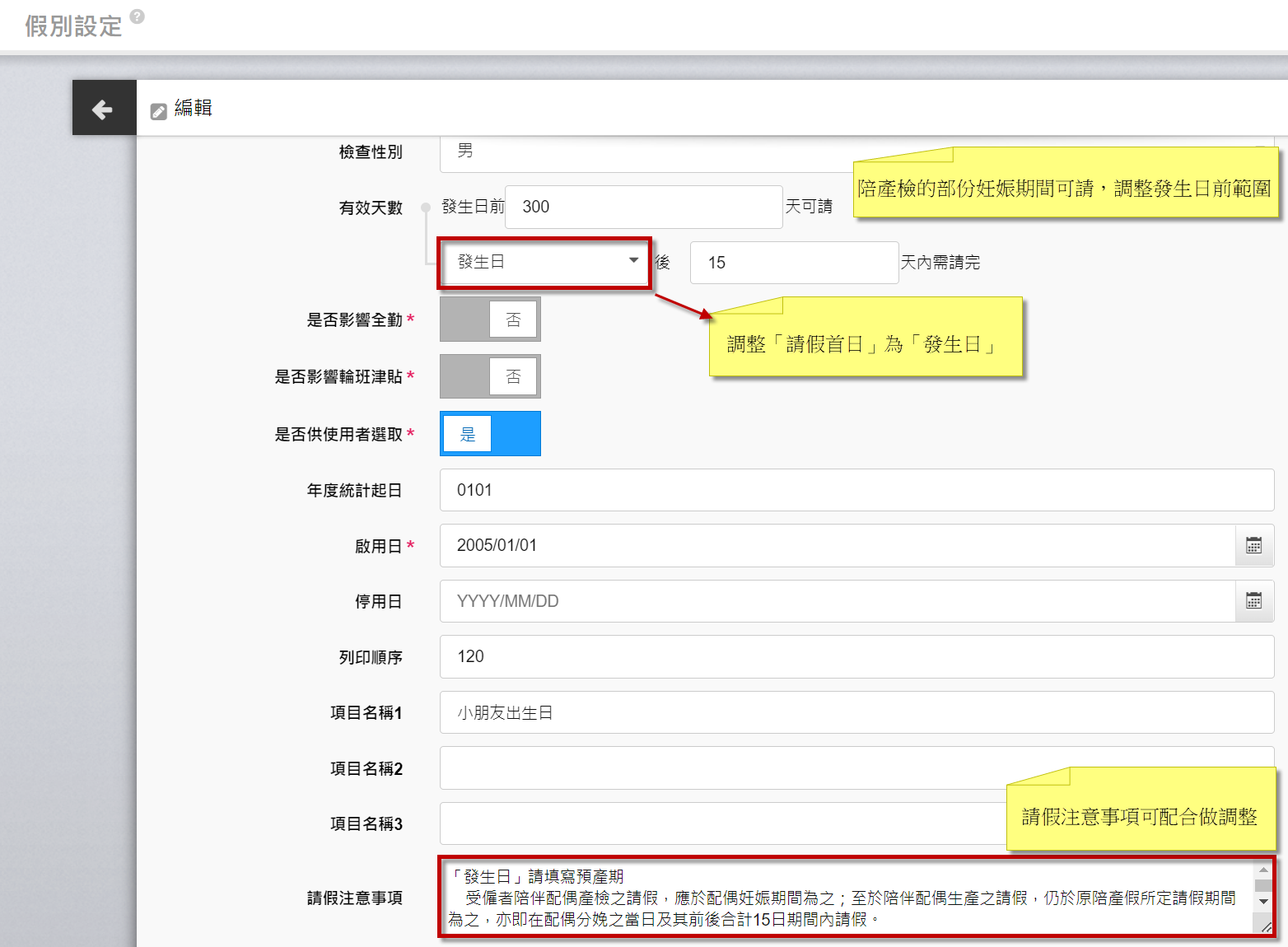 陪產檢及陪產假 X 發生日前 300 天可請, 發生日 15 天內需請完