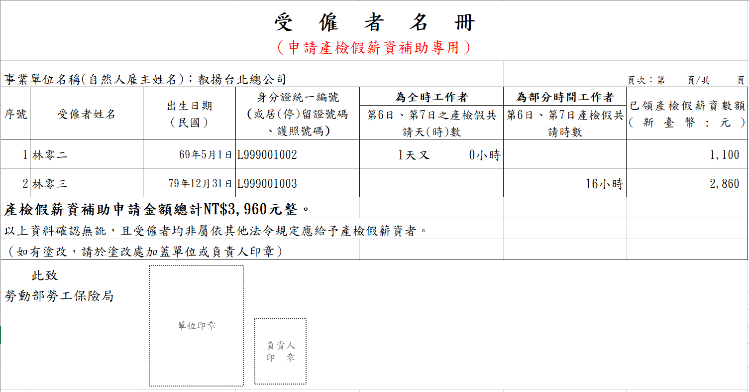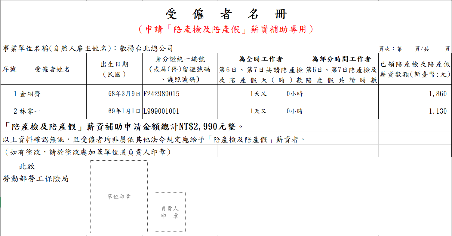 【受僱者名冊】陪產檢及陪產假薪資補助專用