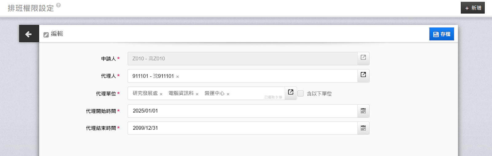 排班權限的代理單位可指定某單位+勾選含以下,或是限定的單位(可多選)