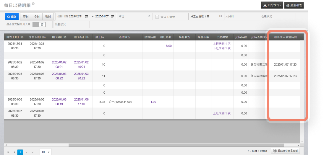 - 每日出勤明細,新增【超時原因填寫時間】。