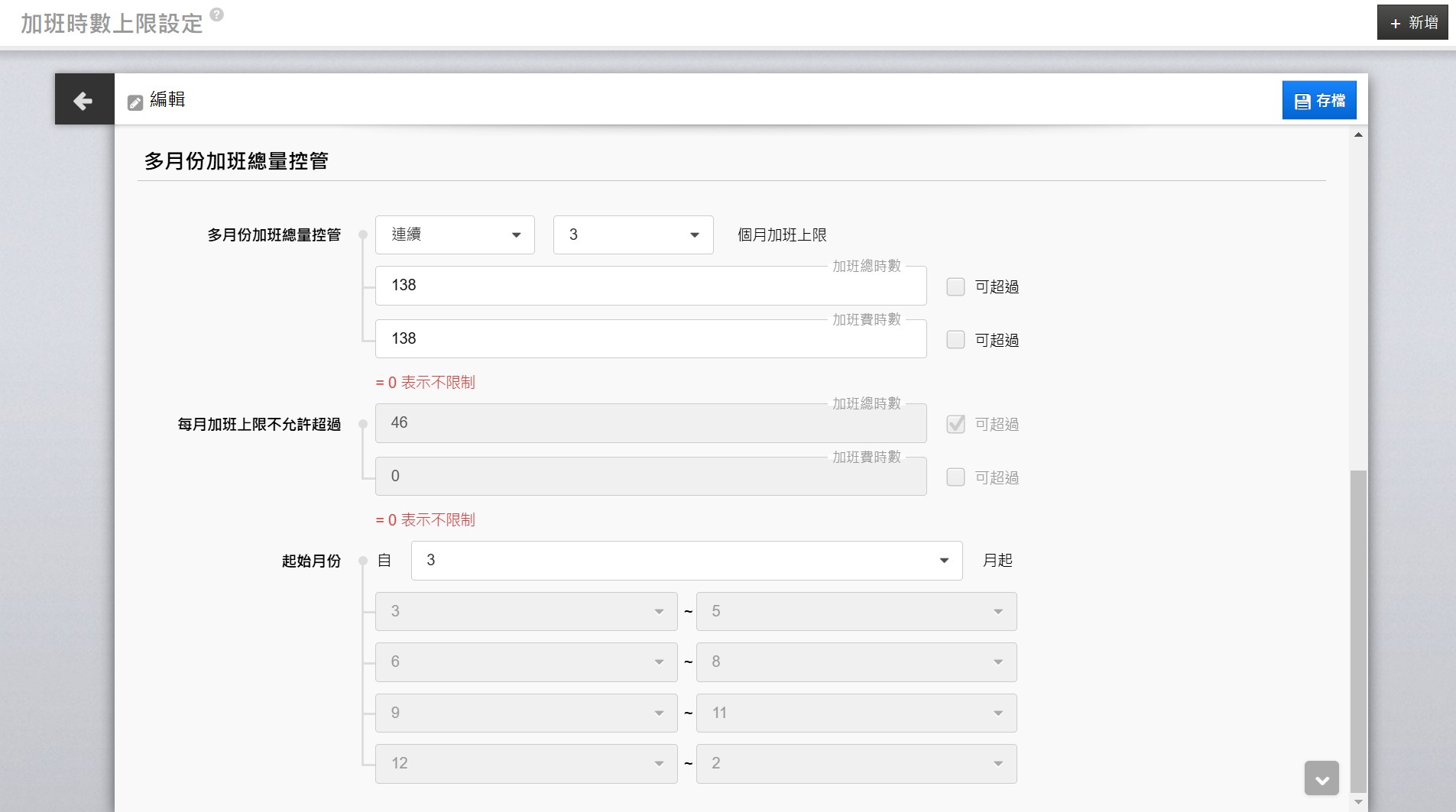 【加班時數上限設定】新增「多月分總量控管」,可設定週期或連續的規則