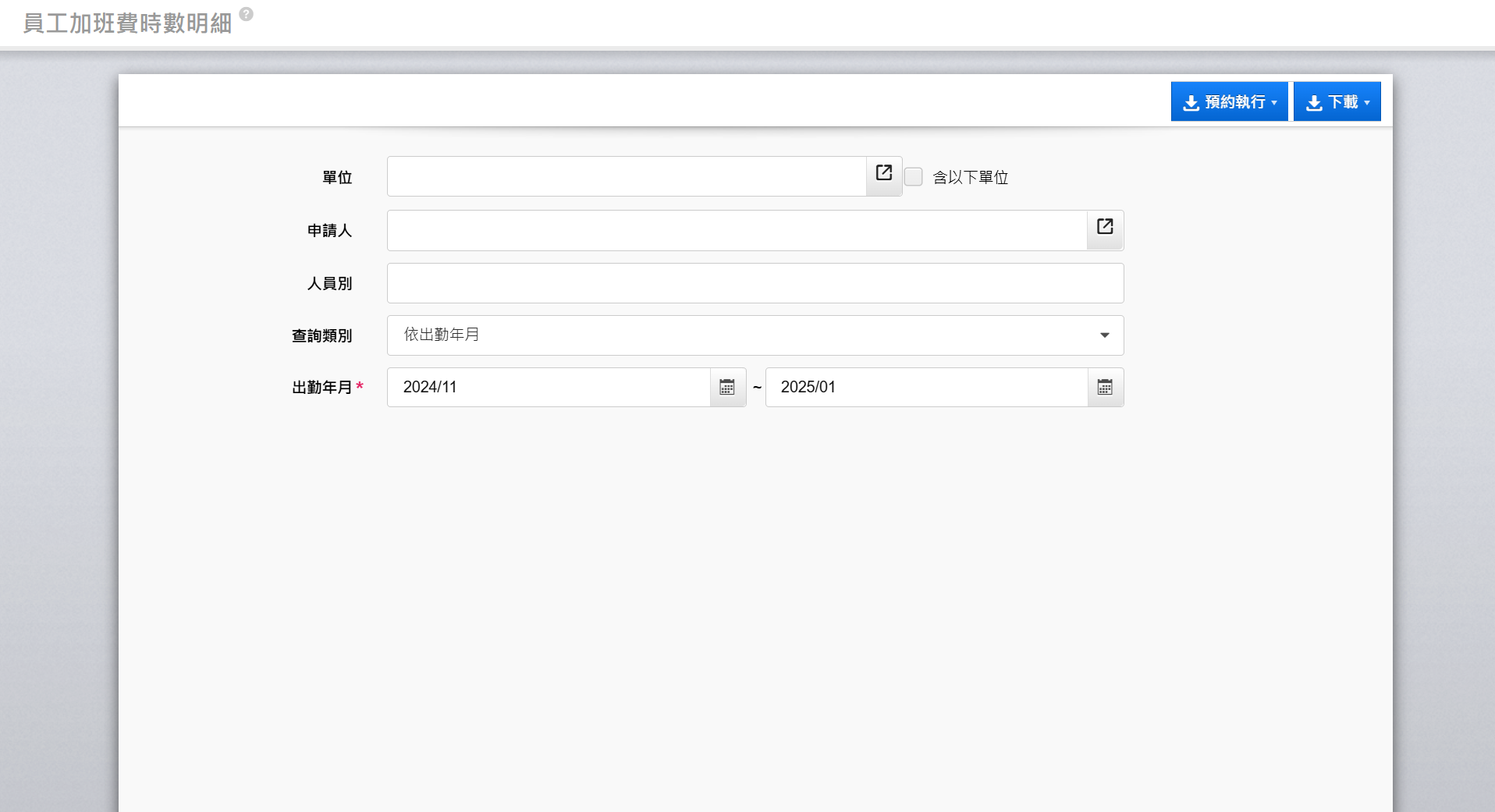 - 【加班時數與費用明細表】報表欄位新增「發薪描述」「給付日」「加班時數總量控管區間」