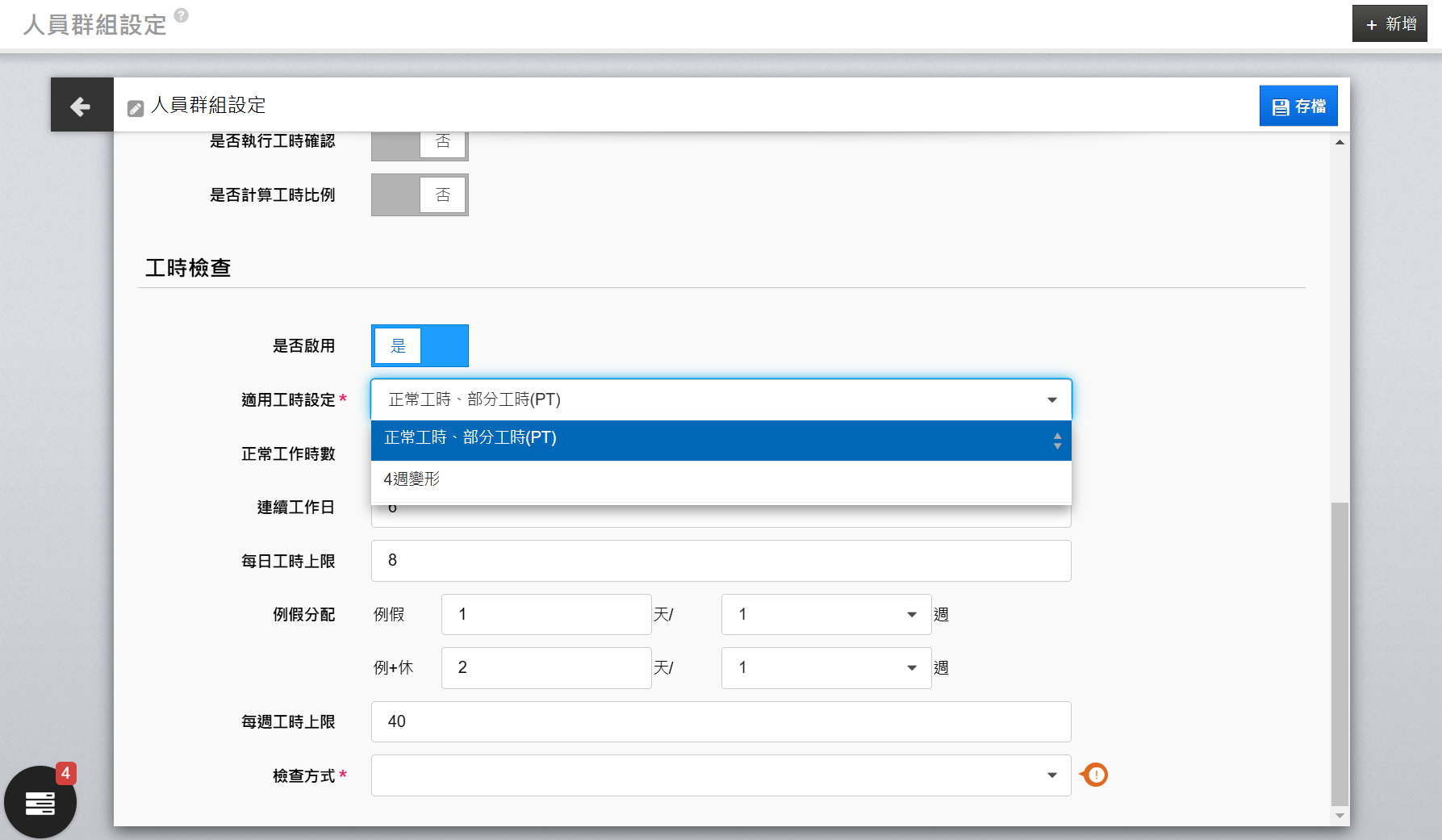 情境:人員群組啟用工時檢查時,所需設定的欄位眾多,目前沒有提供預設設定,使用上較爲不便,故針對介面進行改善,提供相關工時檢查選項與其預設值