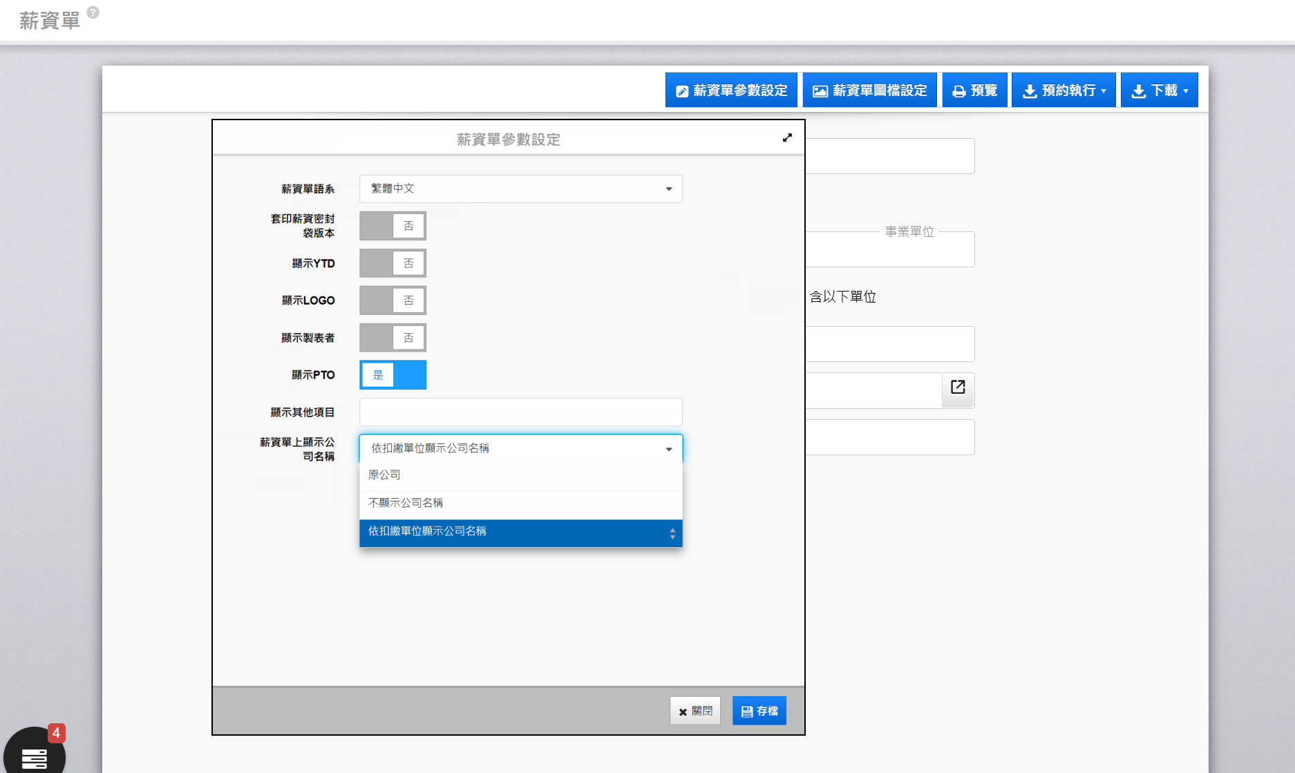 - 薪資單參數設定,公司名稱顯示方式可選擇:原公司/不顯示/依扣繳單位顯示