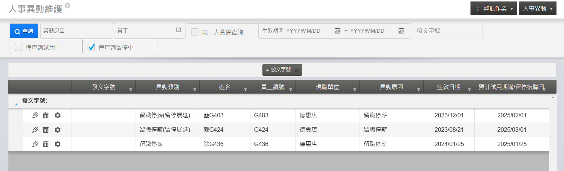 - 【人事異動維護】查詢條件新增「僅查詢留停中」項目