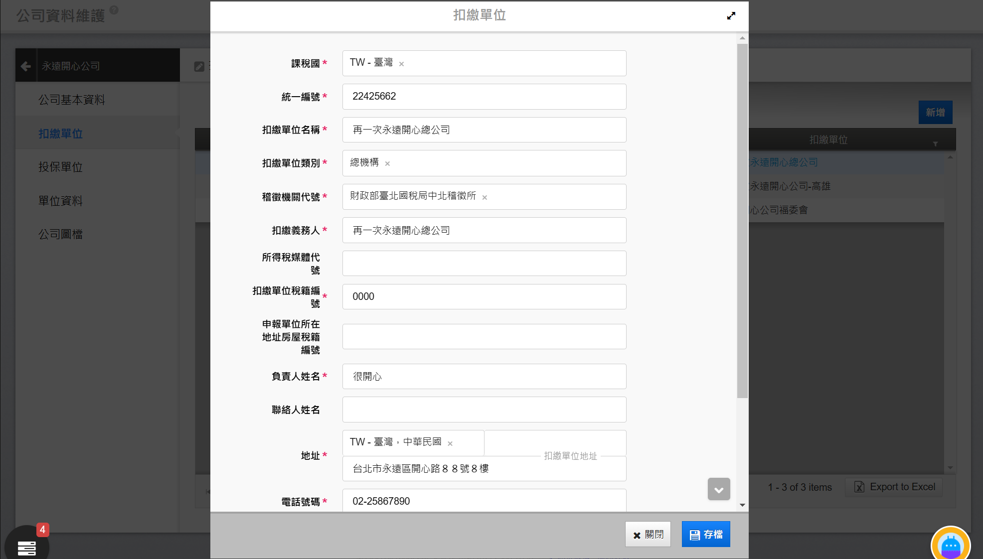 【公司資料維護>扣繳單位】新增負責人姓名欄位;扣繳義務人, 請調整為事業、機關、團體或學校等本身,以符合事責一致