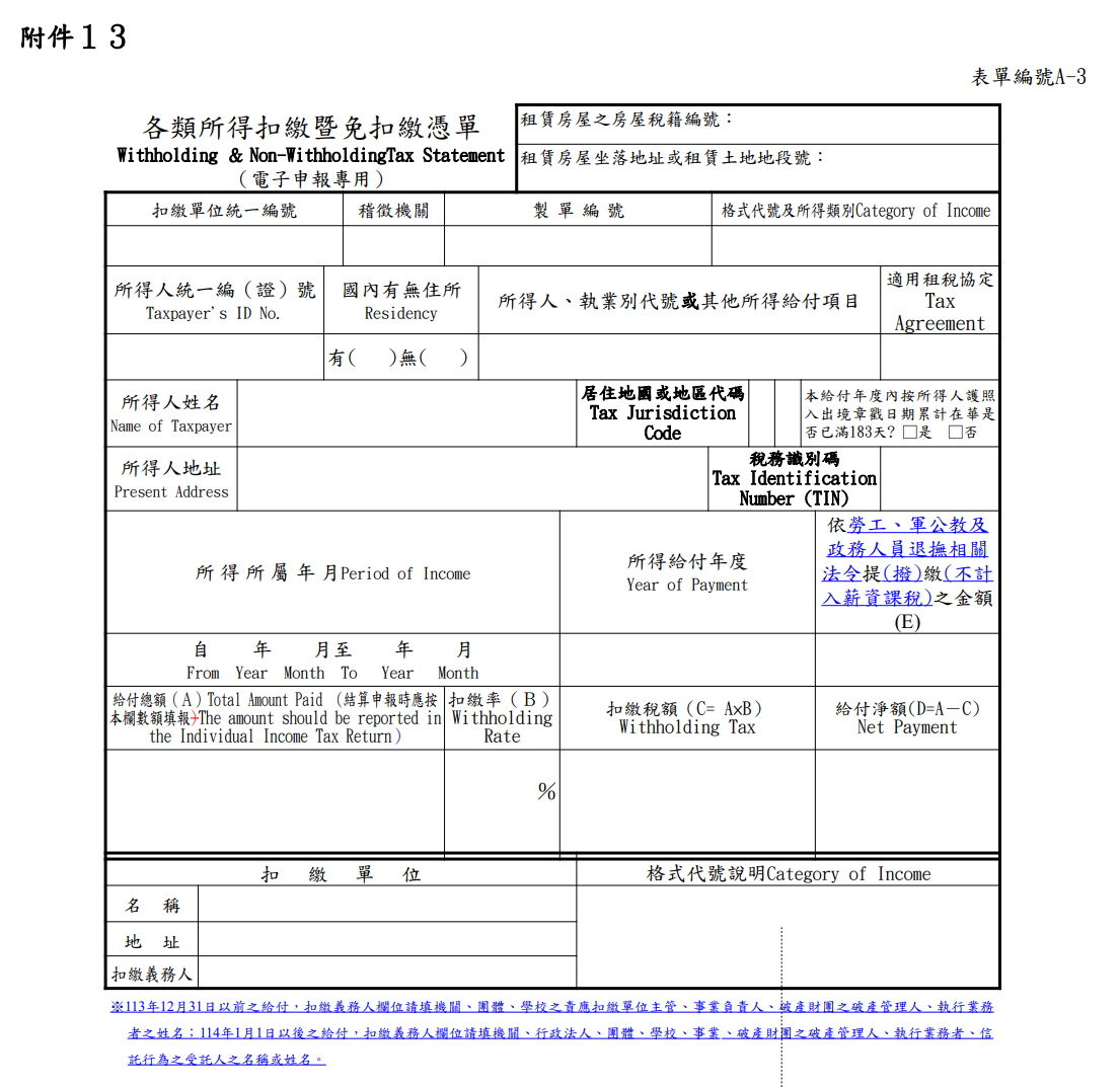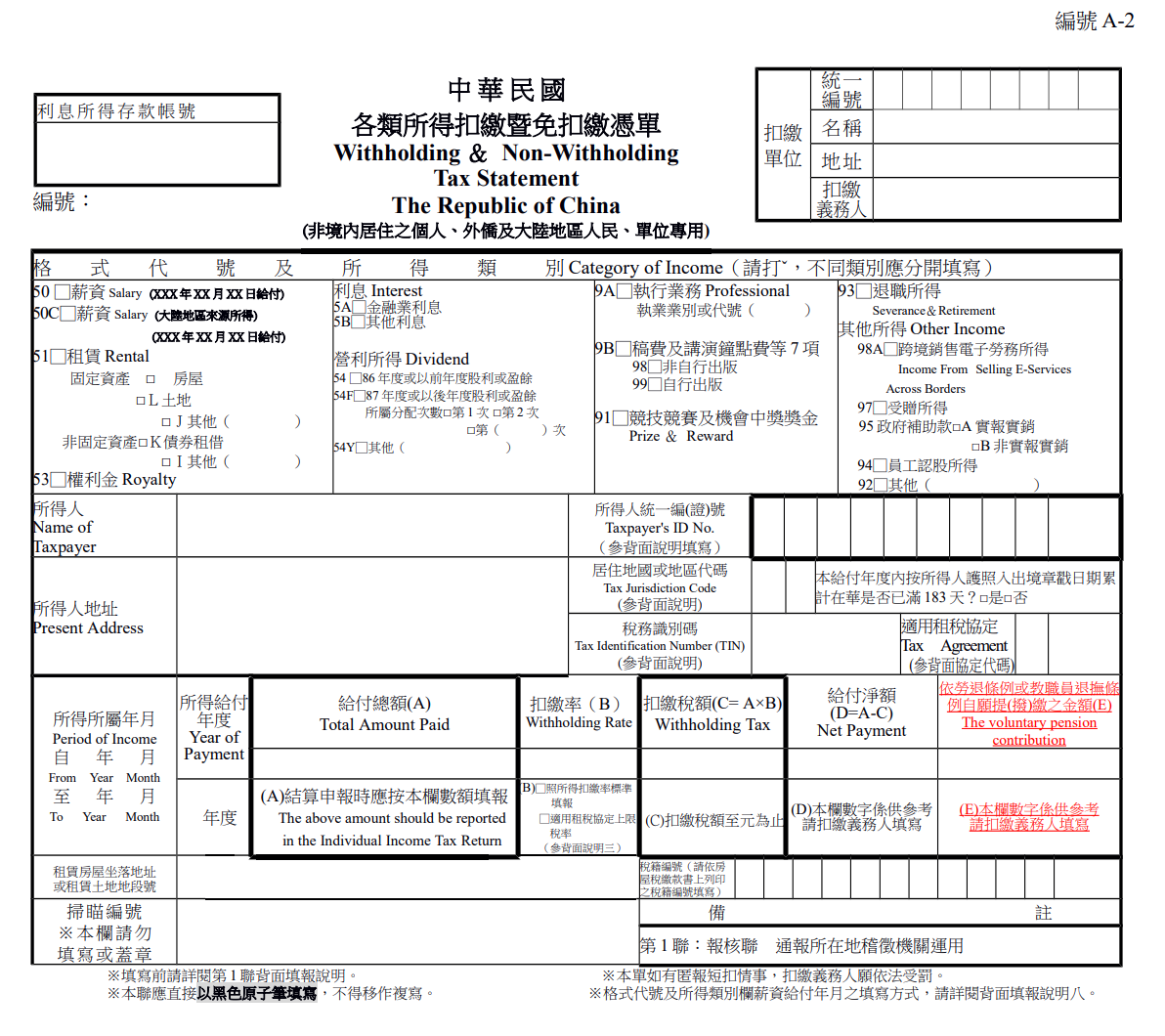 更新各類所得扣繳暨免扣繳憑單(非境內居住之個人、外僑及大陸地區人民、單位專用) 範本