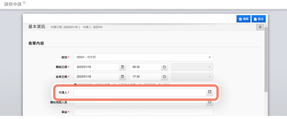 - 若請假區間所選代理人也請假,系統會提醒但仍可送出假單
