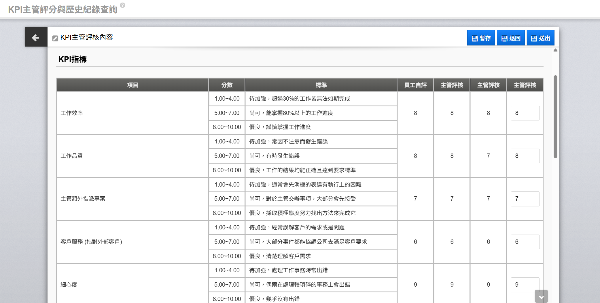 自評及主管評分,依據評核流程設定,至多四個關卡
