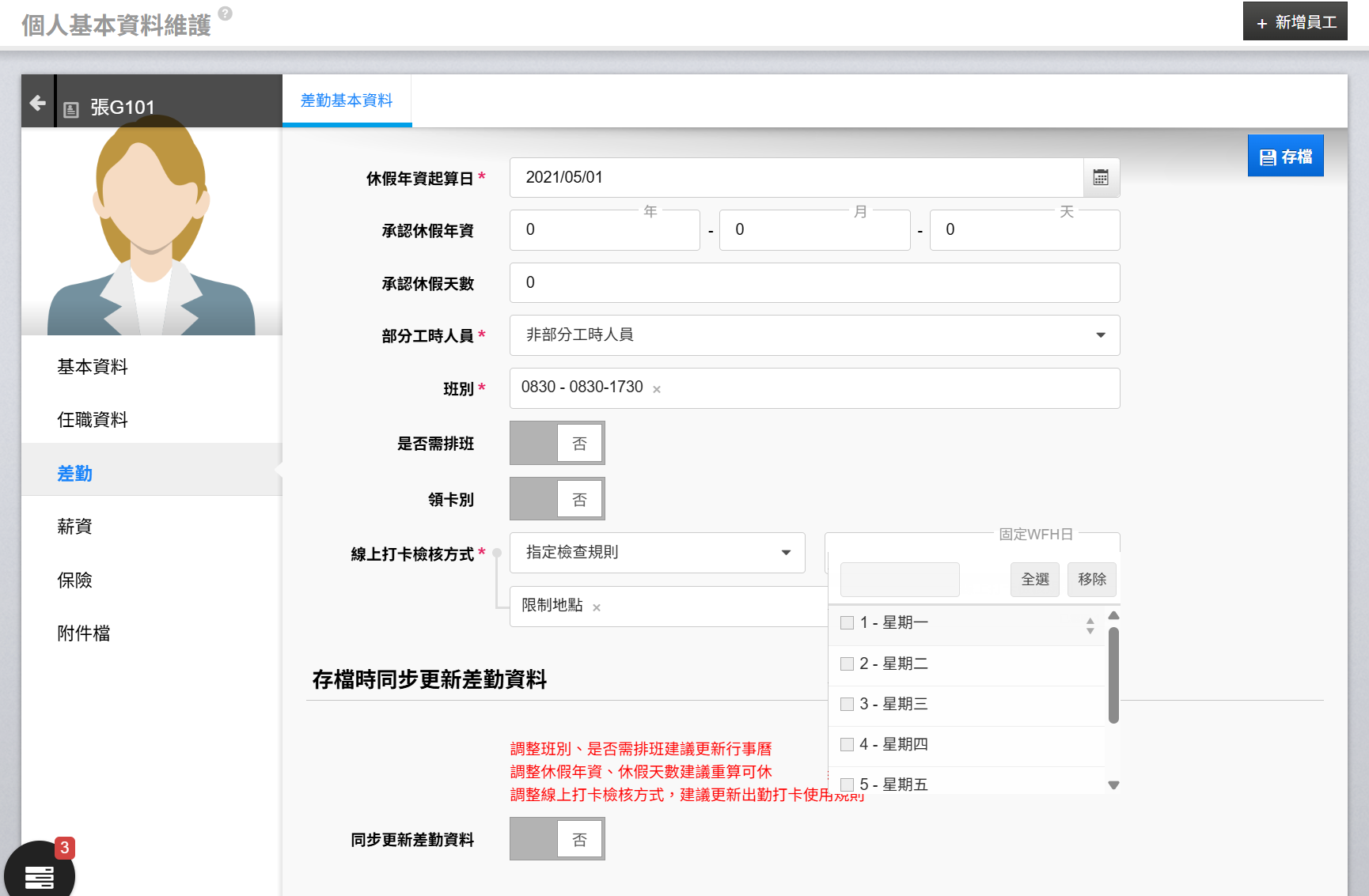 情境:當有提供員工每週固定幾天 WFH,可設定固定 WFH 的日子,則線上打卡檢核規則於 WFH 時可解除限制。