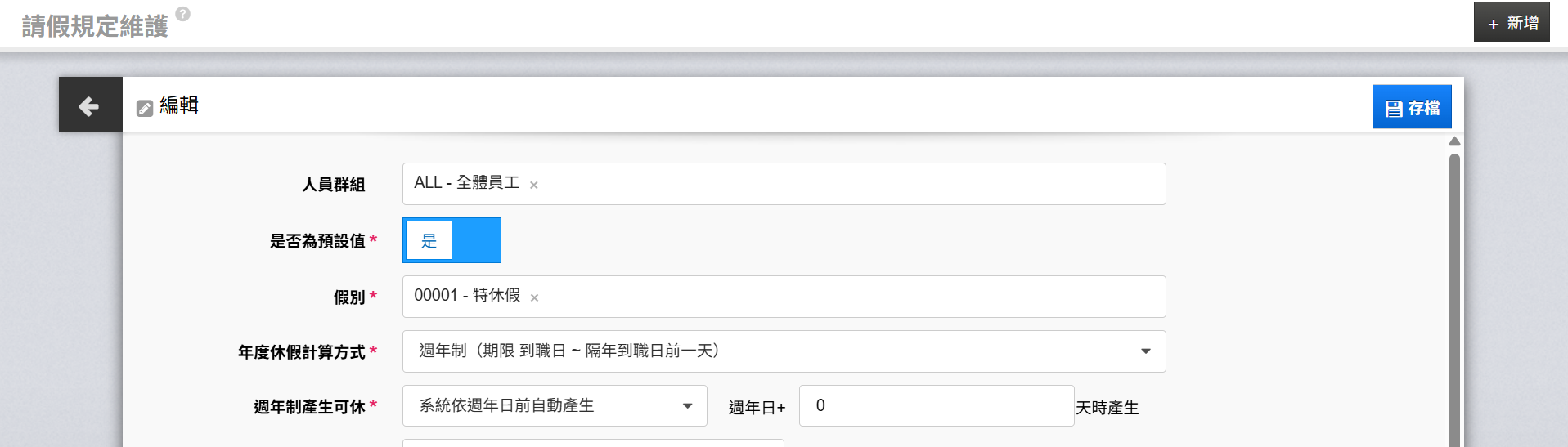 【請假規定維護】新增「週年制產生可休」設定,亦可設定「不自動產生」
