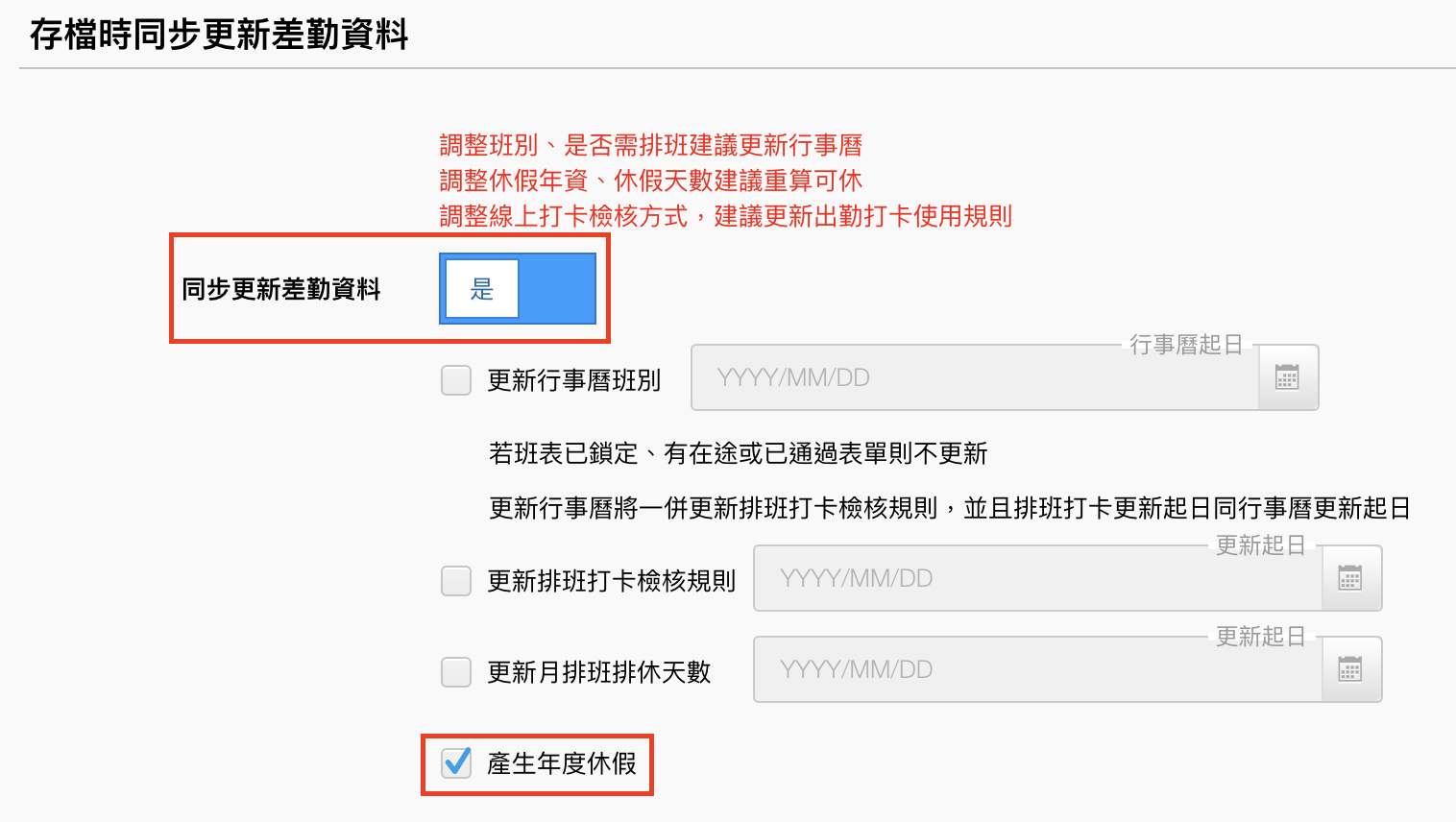 3. 到員工個人基本資料維護裡面的「差勤」去打開「同步更新差勤資料」,勾選「產生年度休假」