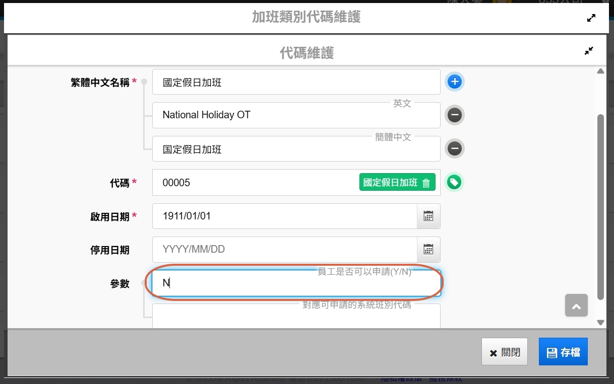 3. 在修改畫面中,找到「員工是否可以申請(Y/N)」的選項,將其修改為「N」,這樣員工將無法申請國定假日的加班。設定完後,若員工嘗試申請國定假日加班,系統將顯示「加班日期無符合的加班類別」。