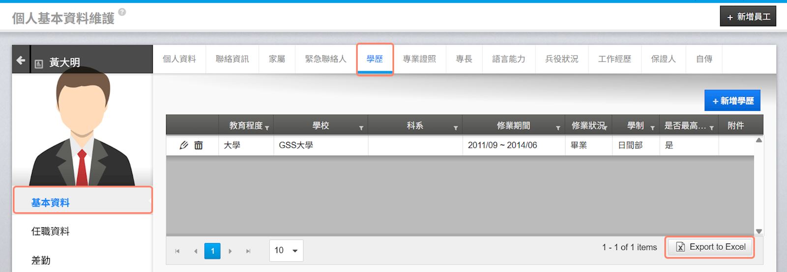 情境:我想下載某位員工完整的學歷與專業證照紀錄,如何操作? 1. 請先至【全站功能>個人基本資料維護】搜尋出該員工資料,點選【鉛筆】進入該員工資料頁面。 2. 在【基本資料】中切換至各個資料區 (圖片以"學歷"作為範例),確認資料無誤,可點選右下角【Export to Excel】下載完整資料。