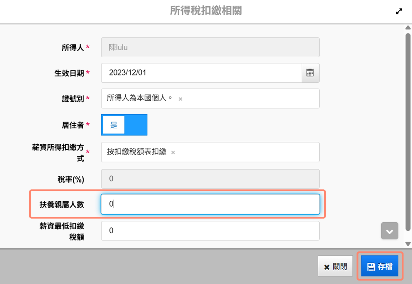 2. 在【扶養親屬人數】欄位可輸入撫養人數,確認資料無誤後點選【存檔】即完成。