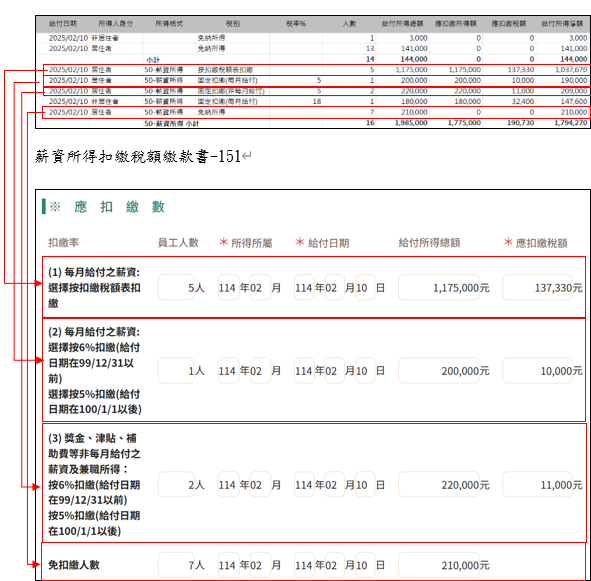 「薪資暨各類所得扣繳稅額繳款統計表」可以提供承辦填寫薪資所得扣繳稅額繳款書-151和各類所得扣繳稅額繳款書-152~158、15B、15U。