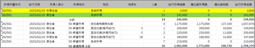 1. 黃色非居住者的免納所得和綠色居住者的免納所得,薪資科目設定的所得稅別為[免稅項目]且所得格式沒有設定。