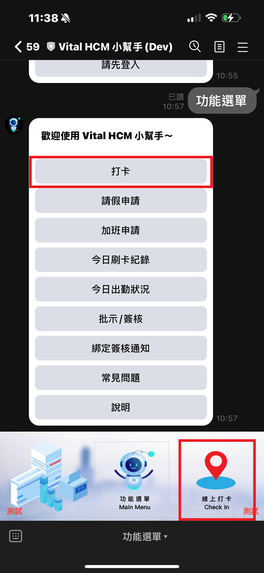 請關閉裝置上該瀏覽頁面,重新至LINE > Vital HCM小幫手,點選下方圖示「功能選單」>「打卡」,或是直接點選下方圖示「線上打卡」,重新導向打卡頁面再執行打卡即可。