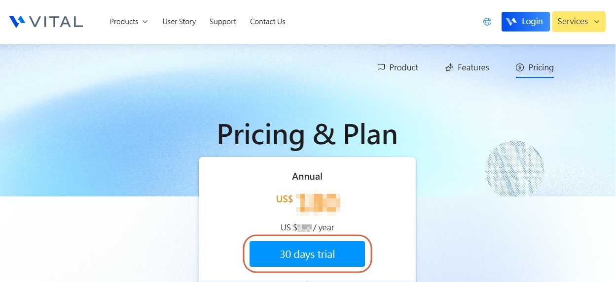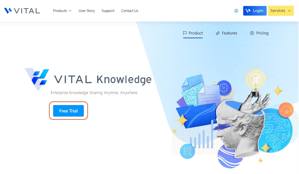 1. Visit Vital Cloud Services Vital Knowledge Website to get started. Click "Free Trial".