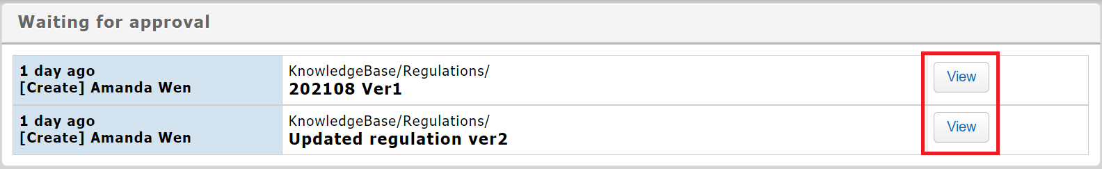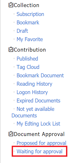 Select [Waiting for approval] in the top right corner. The number inside the parenthesis is the number of documents waiting for approval. Select [Waiting for approval] in the left menu. The documents waiting for approval are listed below. Click [View]. Leave a comment and choose whether to [Agree] or [Disagree] on the proposed document.