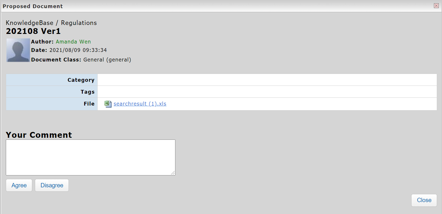 4. Once expanded, the contents and attached files can be viewed. You can leave a comment and choose whether to [Agree] or [Disagree] on the proposed document.