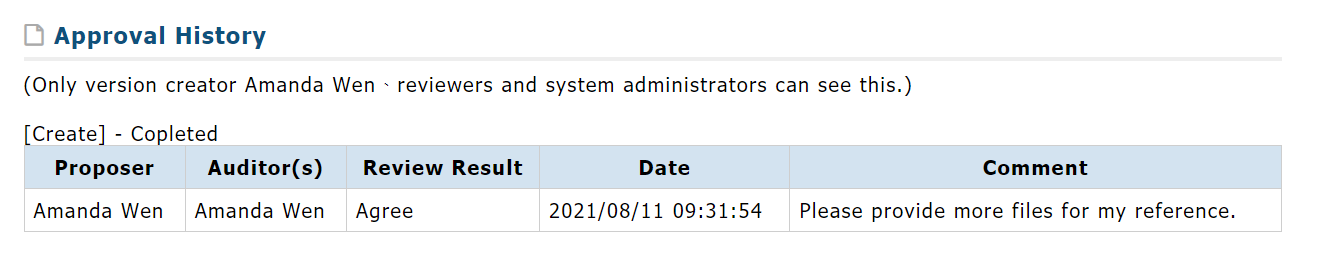 Only the creator, reviewers, and system administrators can view the comments in the Approval History.