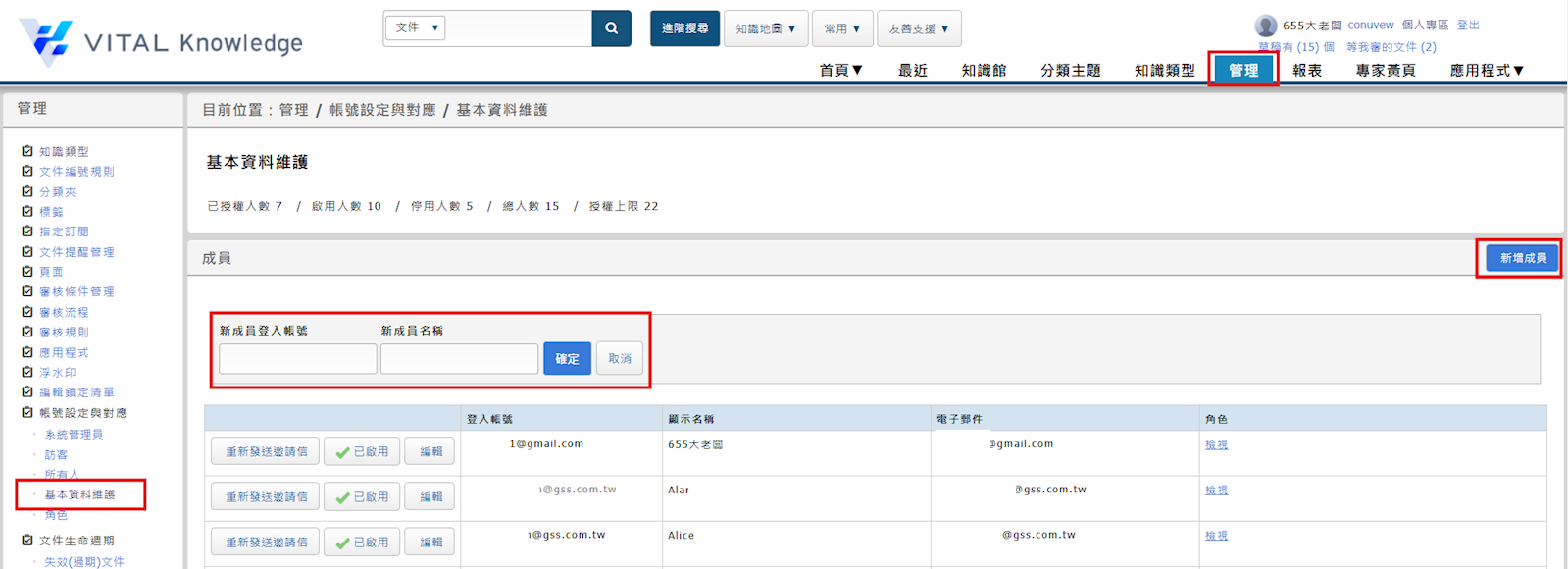 2. 左方「帳號設定與對應」,點選【基本資料維護】,再點選【新增成員】,輸入登入帳號及顯示名稱,點選【確定】完成帳號建立。