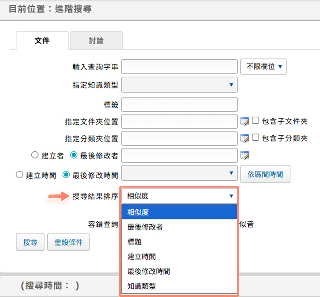 系統上方的搜尋列中搜尋出的資料,預設會以「相似度」排序,若您希望資料以其他方式排序,請使用【進階搜尋】功能。