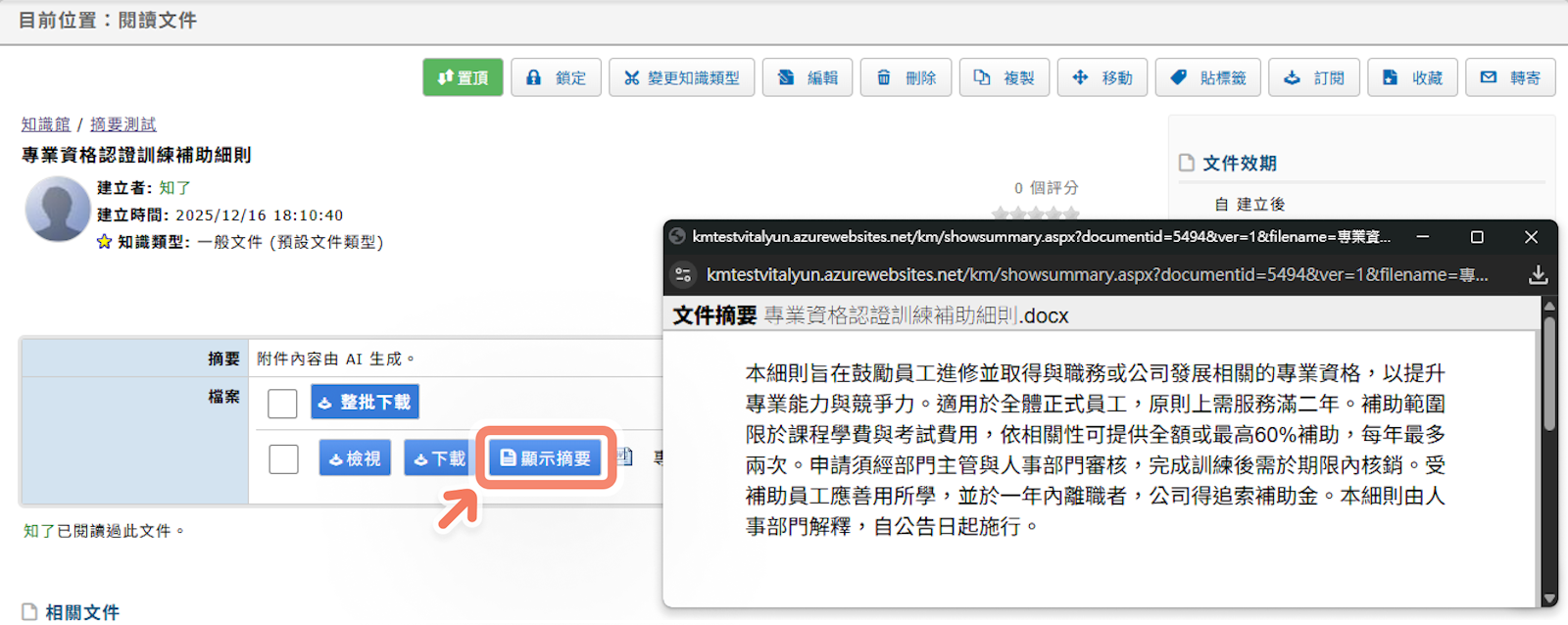 利用大型語言模型產生檔案的摘要,協助使用者快速掌握檔案內容。 僅在【管理 / 智能生成 / 資料來源】的文件會生成摘要內容。