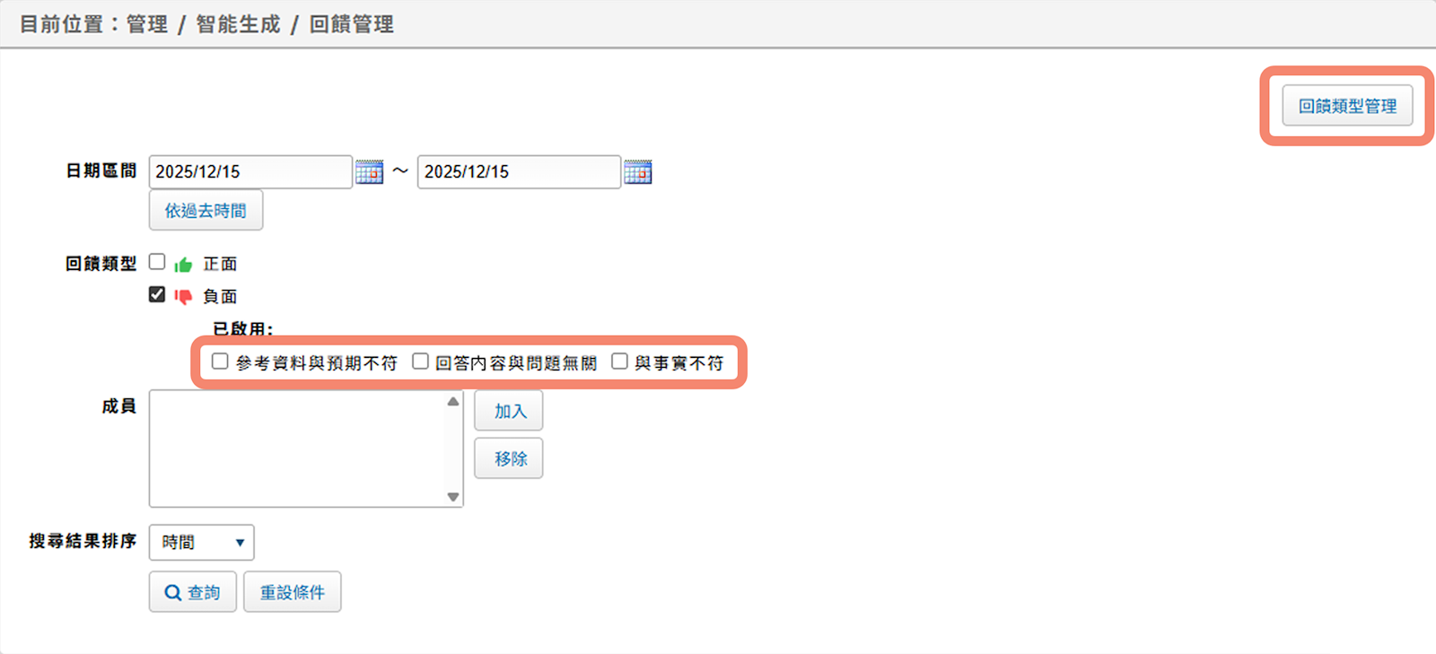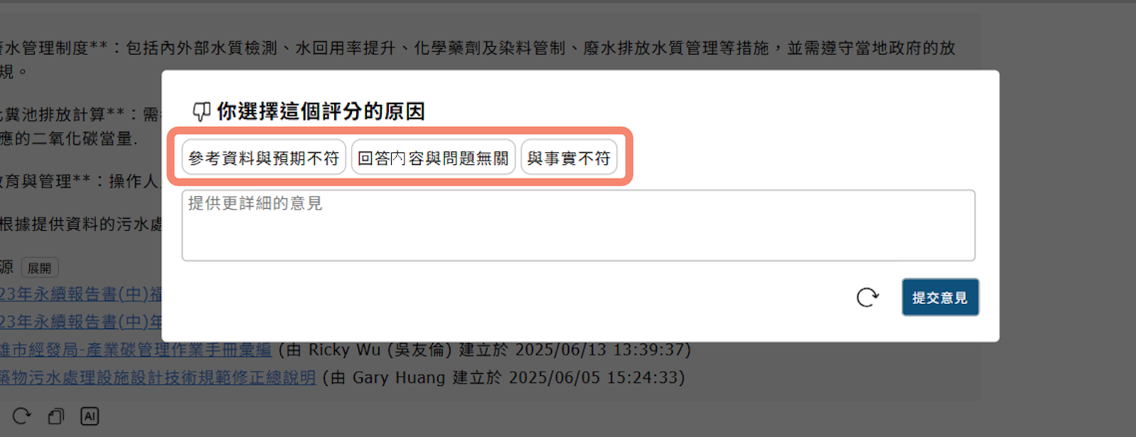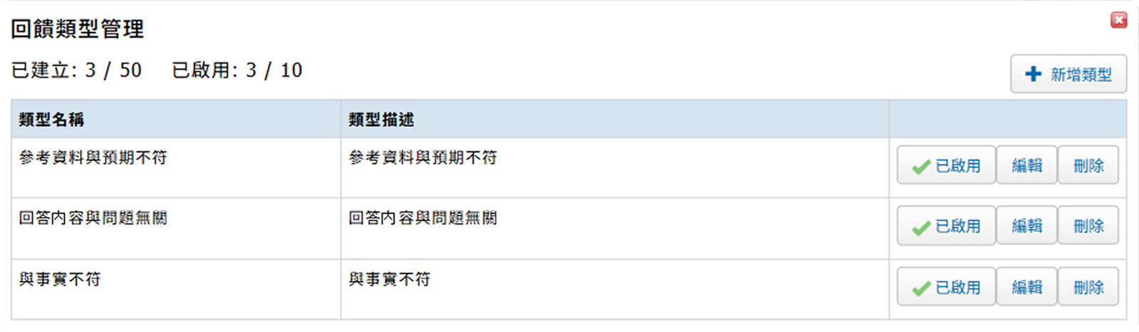 在智能生成完成後,可對生成內容進行回饋。若選擇【不好】可進一步選擇原因。 提供管理者可「自訂」回饋類型,以更有效地統計與分析,如下圖所示。 在【管理 / 智能生成 / 回饋管理】點擊【回饋類型管理】編輯自訂項目。 回饋類型管理—編輯:可建立最多 50 個回饋類型;同時可啟用最多 10 個。