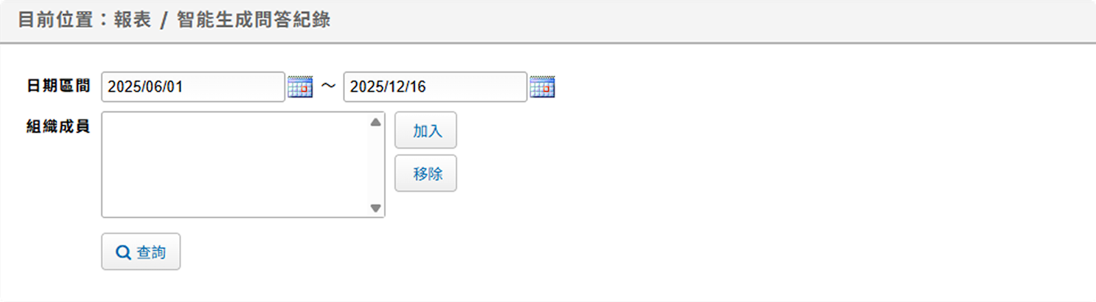 查詢組織或使用者的智能生成記錄,可依日期區間及組織成員進行篩選。