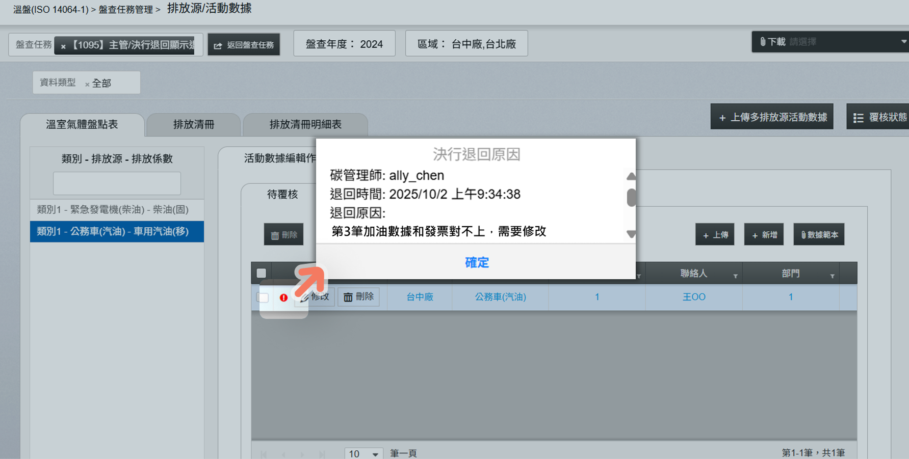 點選【退回】,則會把活動數據退回至【排放源/活動數據】,並且使用紅色驚嘆號圖示標示哪一筆數據被退回。