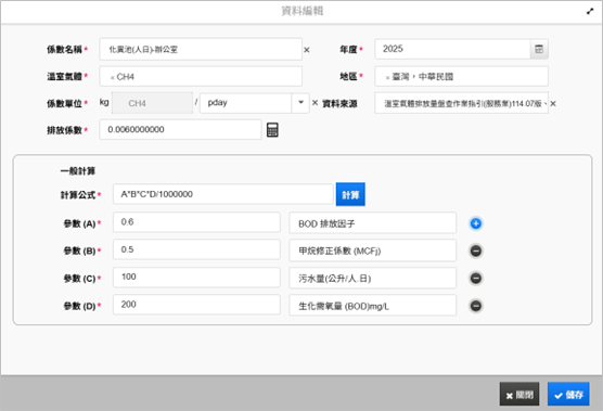自訂係數資料庫【碳足跡係數】「一般計算」模式新增【備註】欄位,使用者可為計算公式中設定的參數(A、B…)加入補充說明,方便後續查驗與維護。