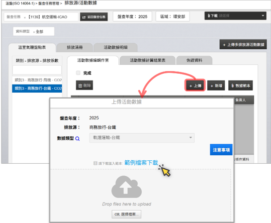 填寫完成後,點擊【排放源/活動數據】>【上傳】將範本匯入系統,系統會將收集到的里程數或碳排放量儲存到系統自動統計碳排放量,並將取得的佐證