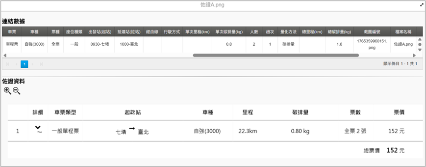 系統新增台鐵運輸類數據類型,當使用者上傳起訖點等資訊,系統會採用RPA(機器人流程自動化)模式,自動收集里程數、碳排量資訊,並取得佐證。