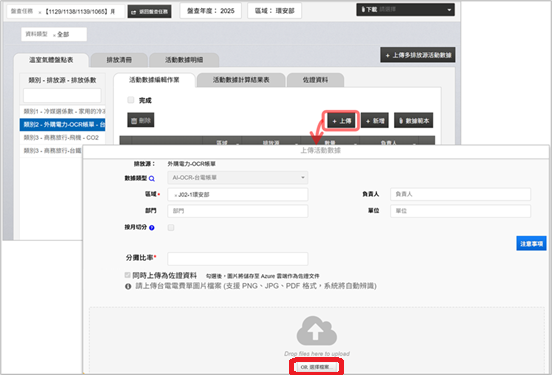 1. 【排放源/活動數據】> 點擊【上傳】,填寫必填欄位【區域】、【分攤比率】等欄位後,將台電電費單檔案上傳