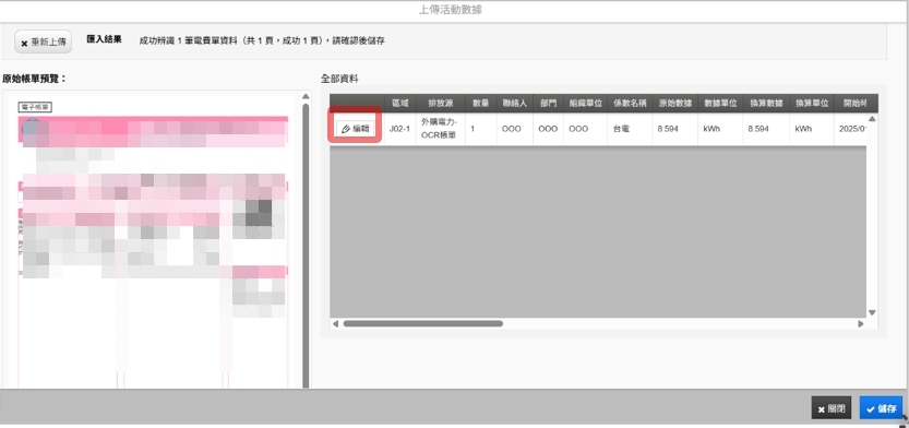若需調整數據,可點擊【編輯】進行修改;確認無誤後,點選右下方【儲存】即可將活動數據與佐證文件一併儲存至系統。