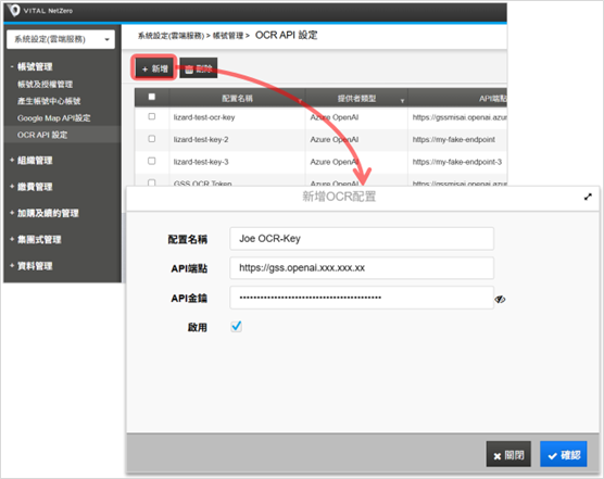 1. 點擊左上方【系統設定】>【帳號管理】> 選擇【OCR API設定】,點擊【新增】,輸入金鑰和其他欄位後按【確認】即完成設定