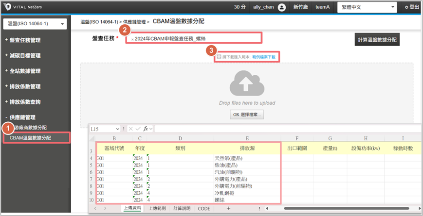 路徑 : 供應鏈管理 > CBAM溫盤數據分配 > 選擇【盤查任務】> 點擊【範例檔案下載】