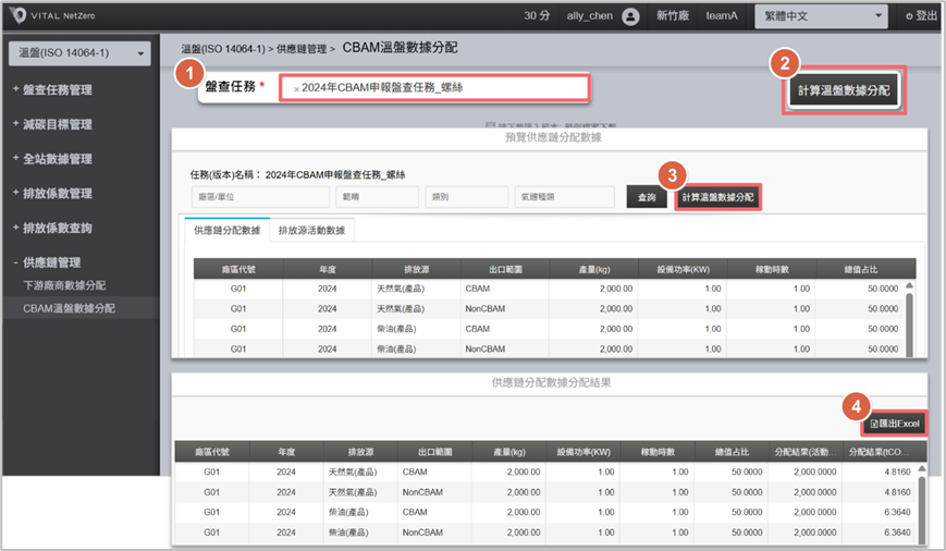 路徑 : 供應鏈管理 > CBAM溫盤數據分配 > 選擇【盤查任務】> 計算溫盤數據分配 > 匯出Excel