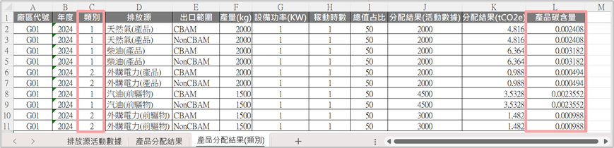 【產品分配結果(類別)】 頁籤中,增加兩個欄位:類別、產品碳含量,協助使用者直接取得產品的碳含量資訊。